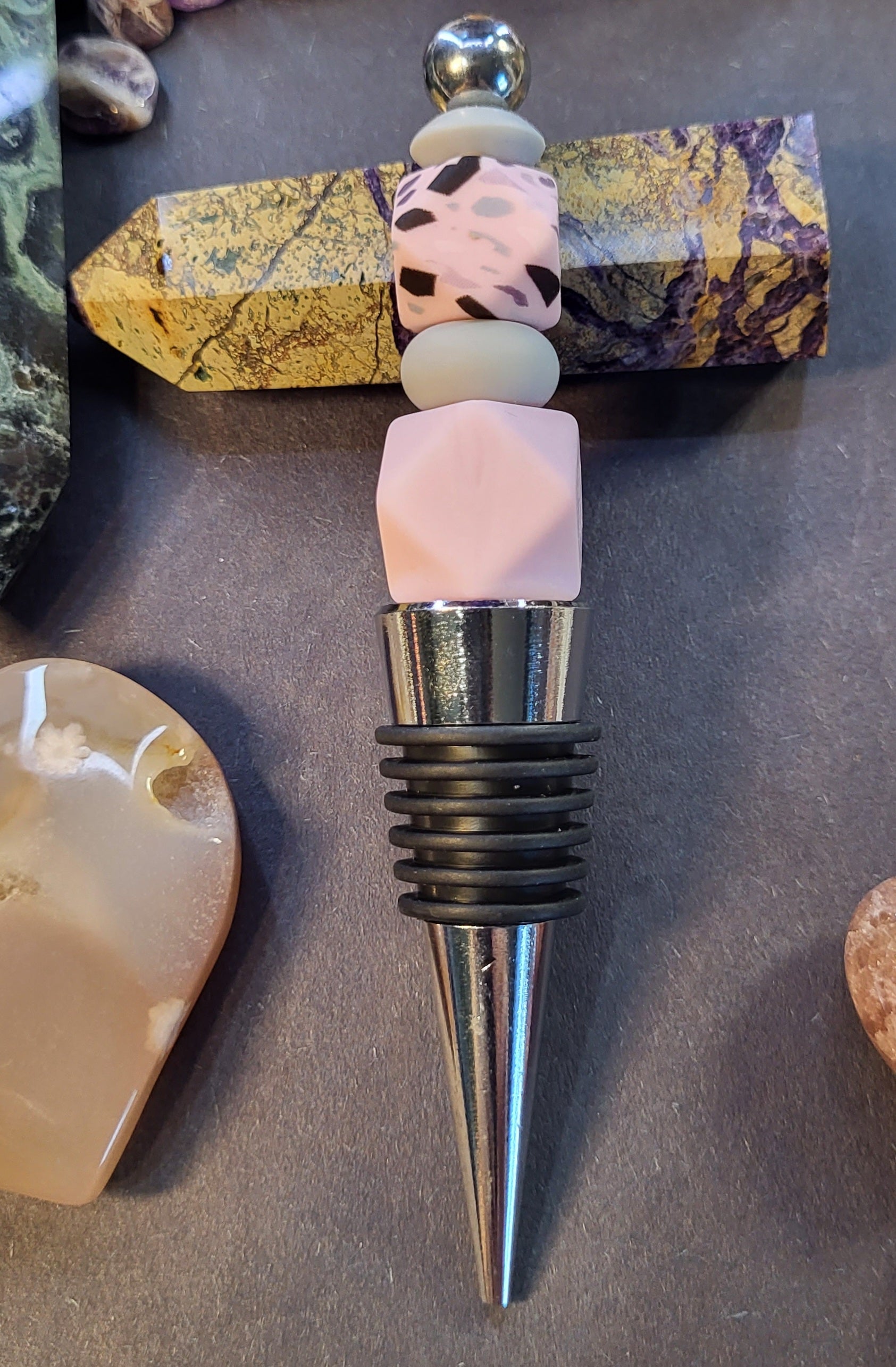 Enhance your wine moments with this charming stopper featuring light pink and grey silicone beads and a captivating pink mosaic hexagon design. Designed to fit easily into your favorite wine bottle, it keeps your wine fresh while adding a stylish touch. For lasting beauty, simply hand wash with mild soap. A perfect blend of function and elegance for any wine lover.